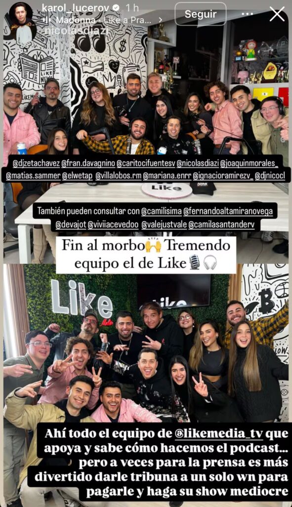 “Fin del morbo, tremendo equipo el de Like. Ahí todo el equipo de Like Media que apoya y sabe cómo hacemos el podcast… pero a veces para la prensa es más divertido darle tribuna a un solo hueón para pagarle y haga su show mediocre”, sentenció sin filtros.