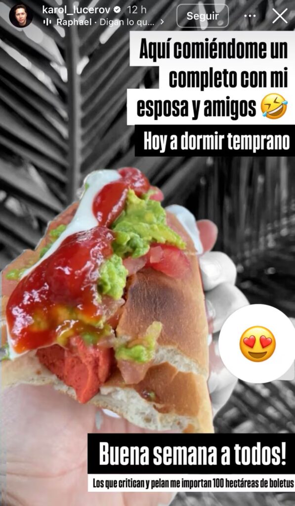 “Aquí comiéndome un completo con mi esposa y amigos. Hoy a dormir temprano. Buena semana a todos”, ironizó en sus historias.