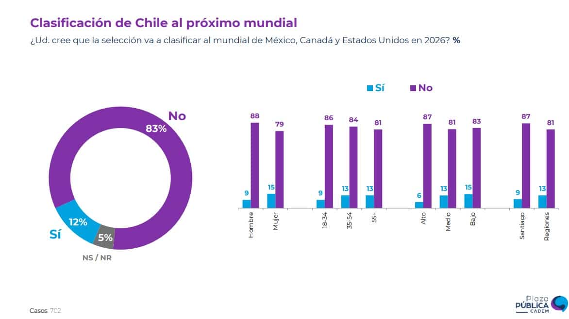 Al consultar a los encuestados sobre la posibilidad de que Chile logre clasificar al próximo Mundial, la respuesta fue clara: un 83% considera que no, mientras que solo un 12% cree que sí.