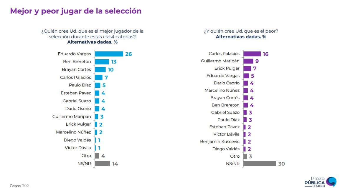 Respecto a quién es el “mejor jugador de la selección durante estas clasificatorias”, el elegido fue Eduardo Vargas, con un 26% de las preferencias. En segundo lugar, se posicionó Ben Brereton con un 13%, seguido por Brayan Cortés, quien obtuvo un 10%.