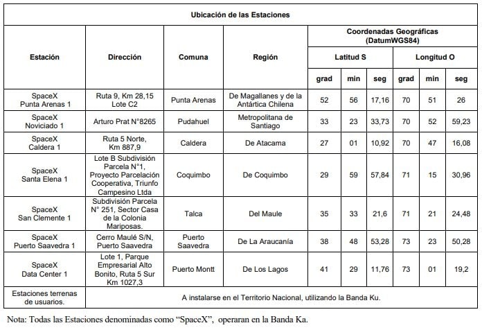 En tanto, en un documento de la Subsecretaría de Telecomunicaciones (Subtel), que recoge una solicitud elevada por la filial Tibro SPA, revela desde donde se establecerán las conexiones con la constelación de Starlink desde Chile.