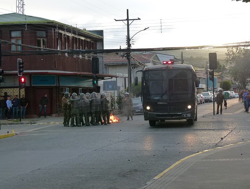 La movilización que inició desde la plaza de armas de Castro, a eso de las 17:30 horas, propició fuertes enfrentamientos entre civiles y Carabineros, donde incluso hubo lluvia de piedras, según lo consignado por Soychiloé.
