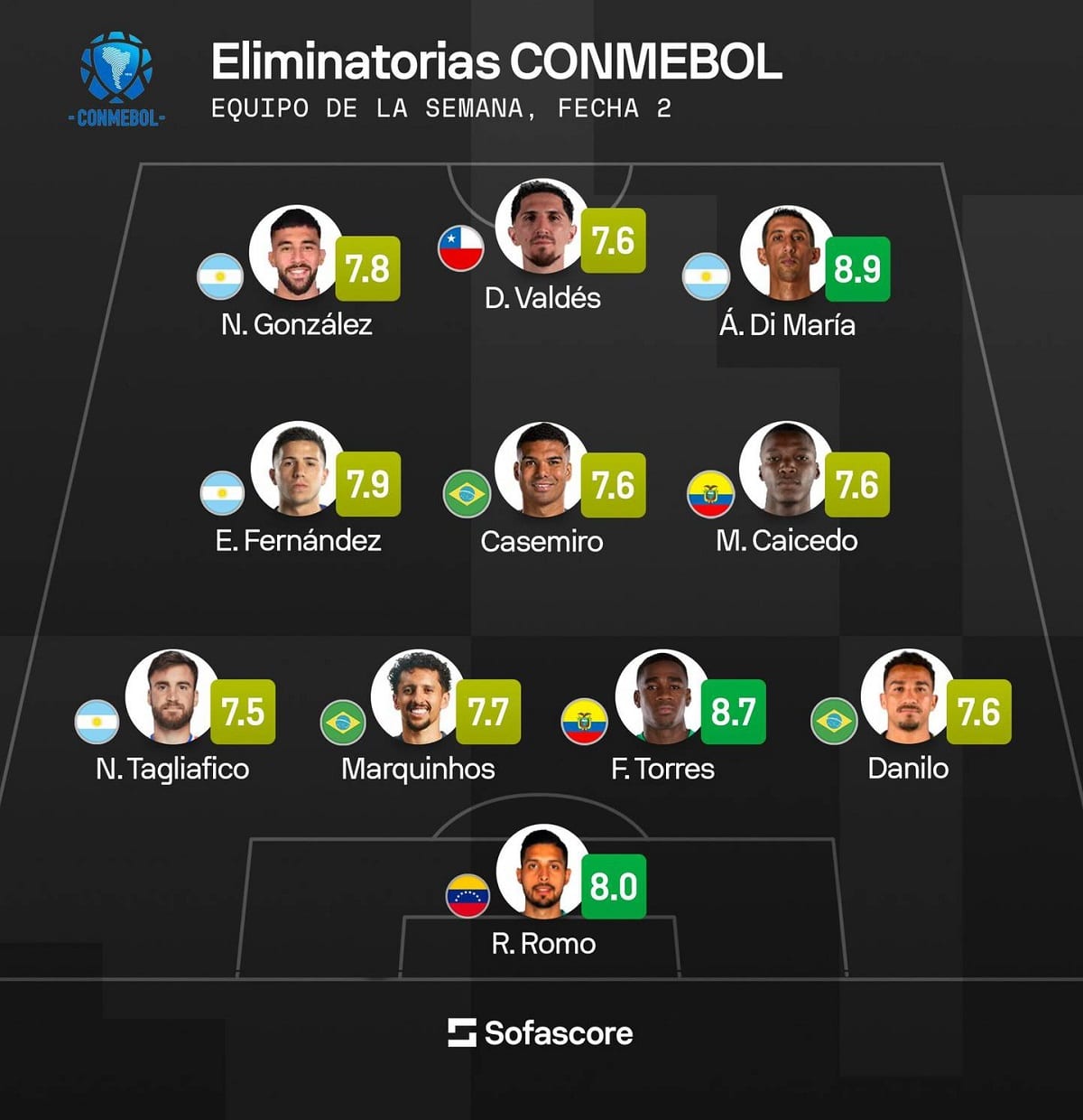 Este equipo ideal está compuesto mayormente por jugadores de otras selecciones sudamericanas, con cuatro argentinos, tres brasileños, dos ecuatorianos, un venezolano y, finalmente, el chileno Diego Valdés. A pesar de la situación complicada de la Roja en las Eliminatorias, el desempeño individual de Valdés recibió elogios por parte de Sofascore.