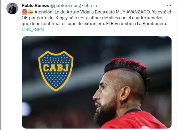 “¡Atención! Lo de Arturo Vidal a Boca está MUY AVANZADO. Ya está el OK por parte del King y sólo resta afinar detalles con el cuadro Xeneize, que debe confirmar el cupo de extranjero. El Rey rumbo a La Bombonera”, anunció Ramos en sus redes sociales.