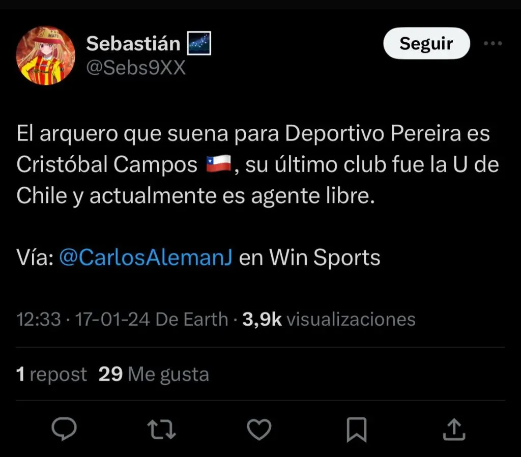 El periodista Carlos Alemán de ‘Winsports’ en Colombia informa que el Deportivo Pereira tiene en la mira al arquero chileno para la temporada actual.