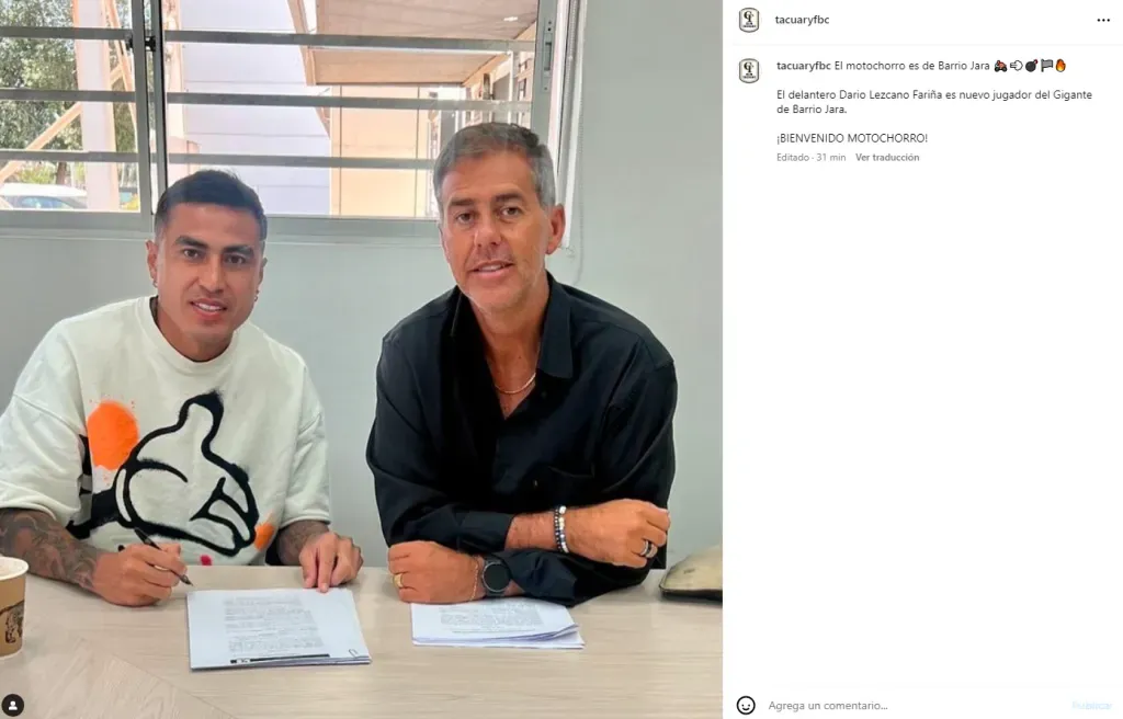 A través de sus redes sociales, Tacaury dio la bienvenida al experimentado centrodelantero, expresando: “El delantero Darío Lezcano Fariña es nuevo jugador del gigante de Barrio Jara. Bienvenido Motochorro”.