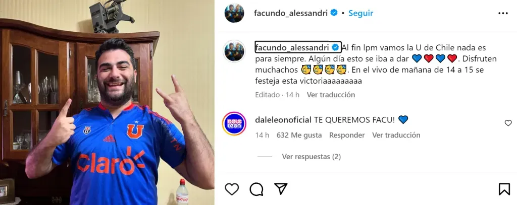 “Al fin lpm vamos la U de Chile nada es para siempre. Algún día esto se iba a dar. Disfruten muchachos. En el vivo de mañana de 14 a 15 se festeja esta victoriaaaaaaaaa”, escribió el influencer, mostrando su apoyo al equipo universitario.