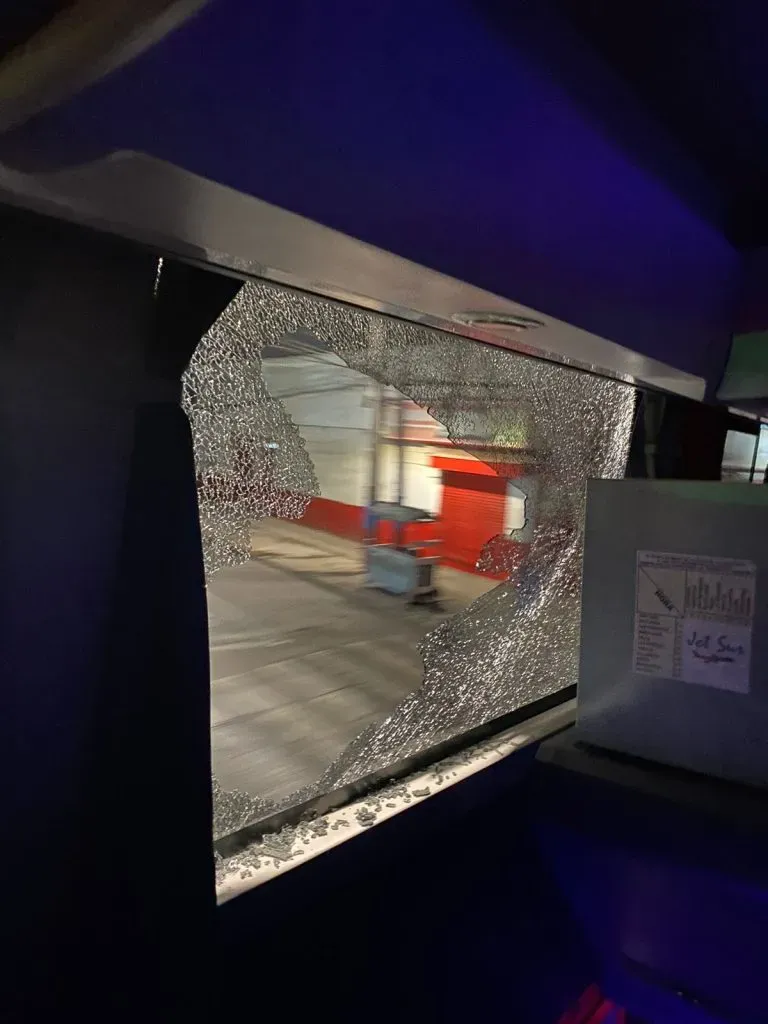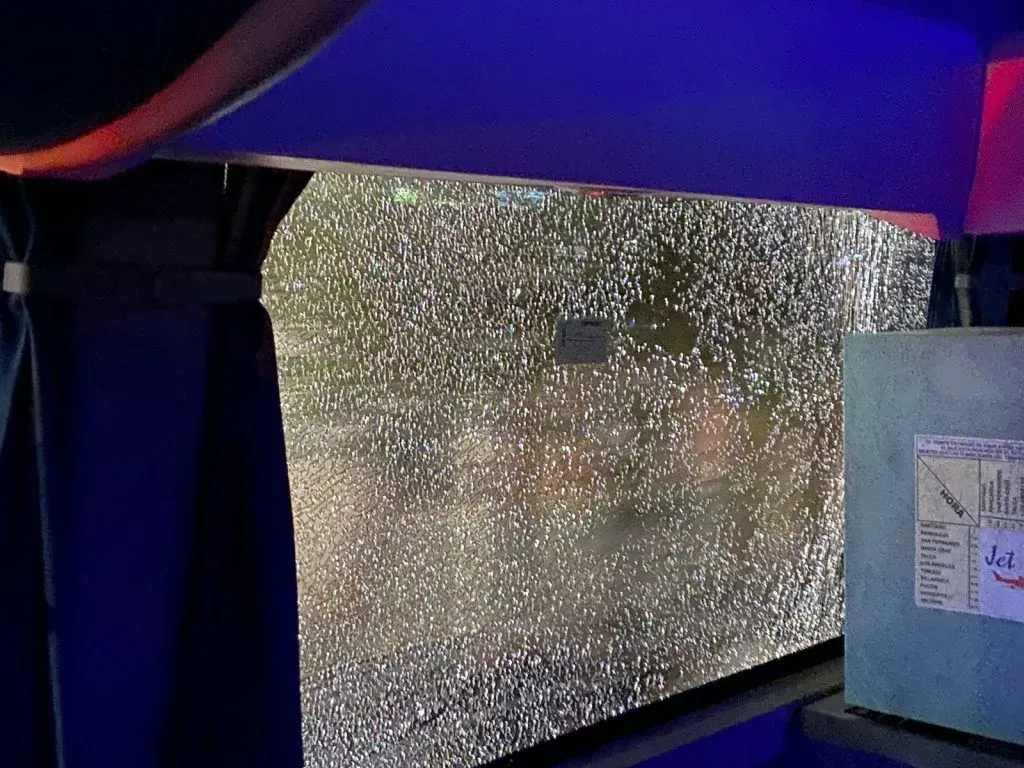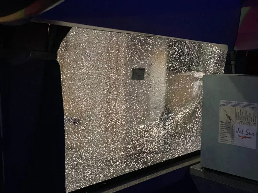 Como consecuencia del asalto, varias ventanas del vehículo, propiedad de la empresa Jet Sur, acabaron destrozadas.