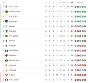 Universidad de Chile en la Tabla de posiciones