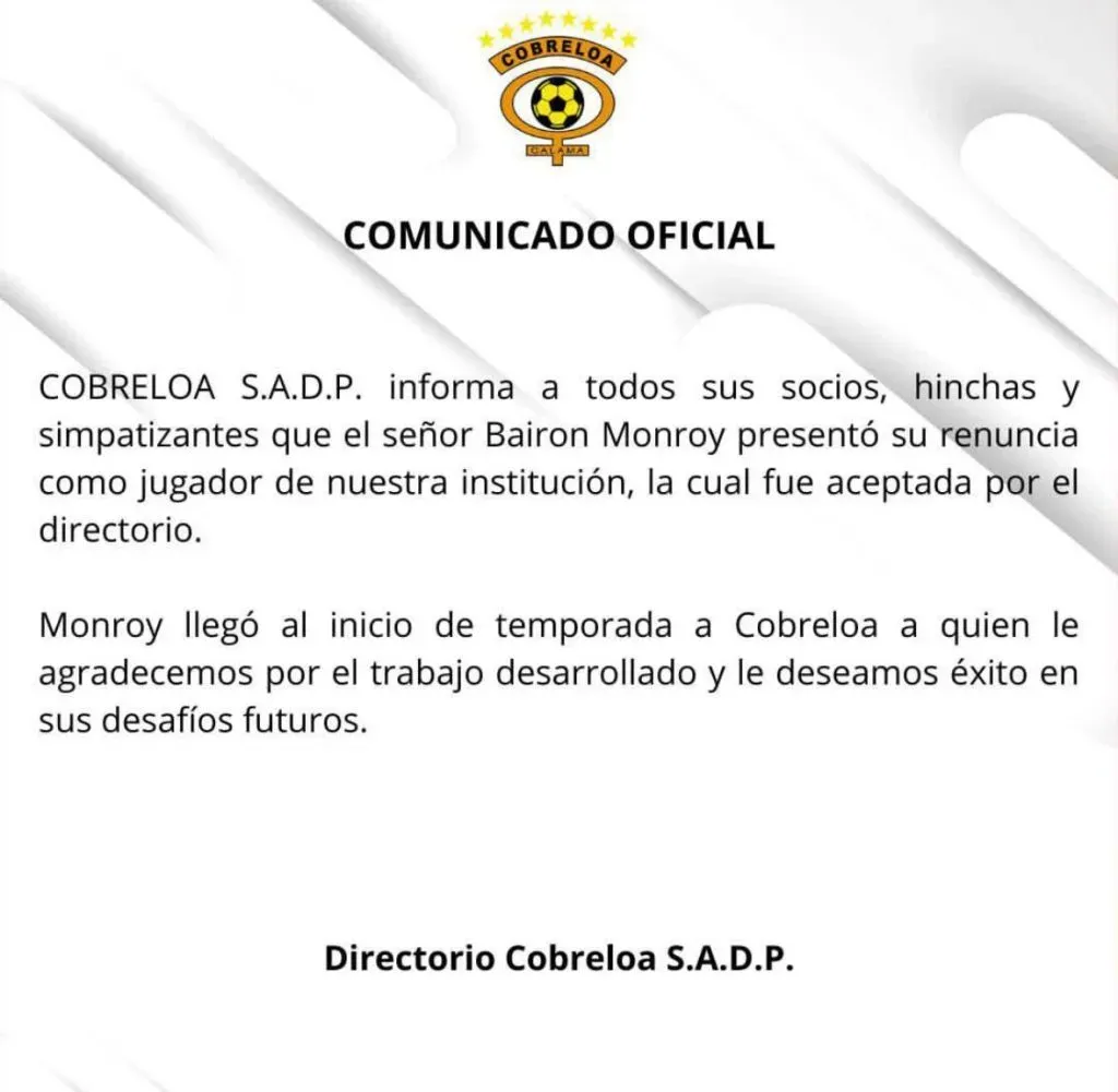 “Cobreloa S.A.D.P. informa a todos sus socios, hinchas y simpatizantes que el señor Bairon Monroy presentó su renuncia como jugador de nuestra institución, la cual fue aceptada por el directorio.”