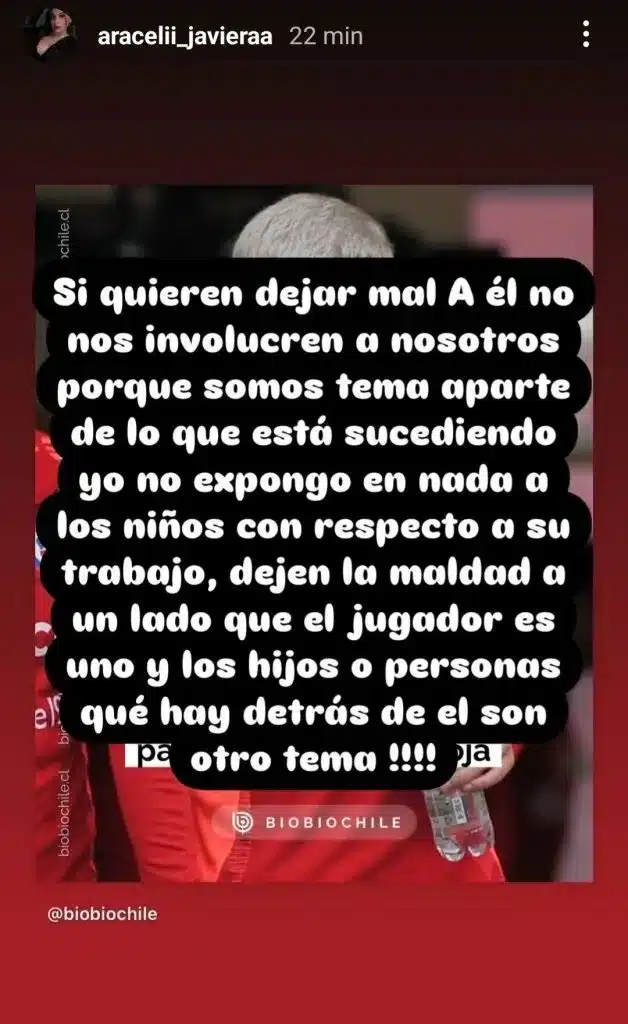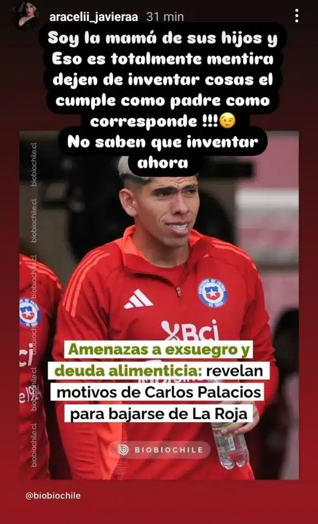 En medio de la controversia, una publicación en Instagram de la ex pareja de Palacios, quien es la madre de sus hijos, se volvió viral. A través de su cuenta @aracelii_javieraa, ella salió en defensa del jugador y desmintió los rumores que afectan a su familia.