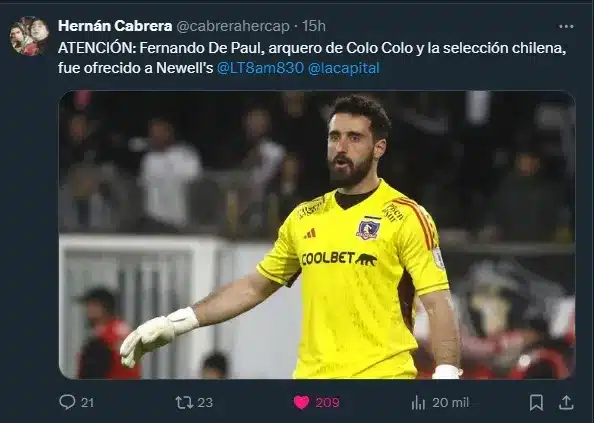El interés por el arquero del “Cacique” fue revelado por el periodista argentino Hernán Cabrera en su cuenta de ‘X‘ (anteriormente Twitter), donde aseguró que el nombre de Fernando de Paul fue ofrecido al conjunto rosarino de cara a la temporada 2025.
