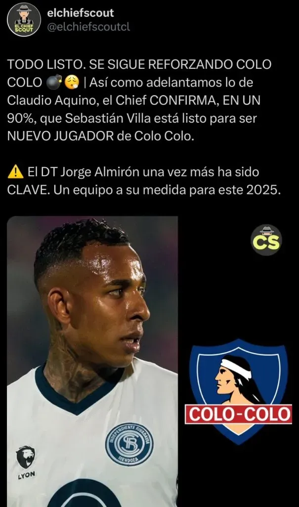 “Todo listo, se sigue reforzando Colo Colo. Así como adelantamos lo de Claudio Aquino, el Chief confirma en un 90% que Sebastián Villa está listo para ser nuevo jugador de Colo Colo. El DT Jorge Almirón una vez más ha sido clave”, señalaron.