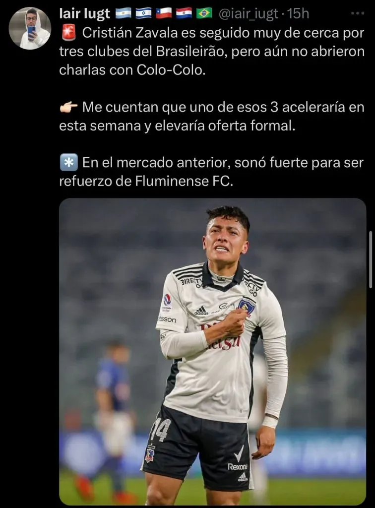 “Cristián Zavala es seguido de muy cerca por tres clubes del Brasileirao, pero aún no abrieron charlas con Colo Colo. Me cuentan que uno de esos tres aceleraría en esta semana y elevaría oferta formal”, informó Iugt en su cuenta de ‘X’, lo que indica que las negociaciones podrían intensificarse en los próximos días.