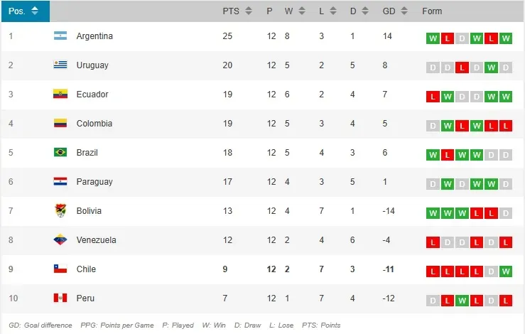 Después de 12 fechas disputadas, Chile ocupa el 9° lugar de la tabla con 9 puntos, una posición complicada. Sin embargo, con el nuevo formato de clasificación, donde seis selecciones acceden de manera directa y la séptima va al repechaje, aún existe una posibilidad matemática de clasificar.