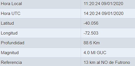 El epicentro se situó a 13 km al NO de Futrono y tuvo una intensidad de 4.0 con una profundidad de 88.6 Km.