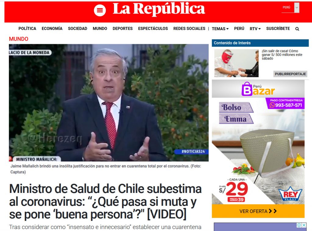 Otro medio que critico la frase del ministro fue el sitio LR de Perú en donde señalan que “Tras considerar como “insensato e innecesario” establecer una cuarentena total en Chile, el ministro de Salud volvió a subestimar la gravedad del brote de coronavirus”.