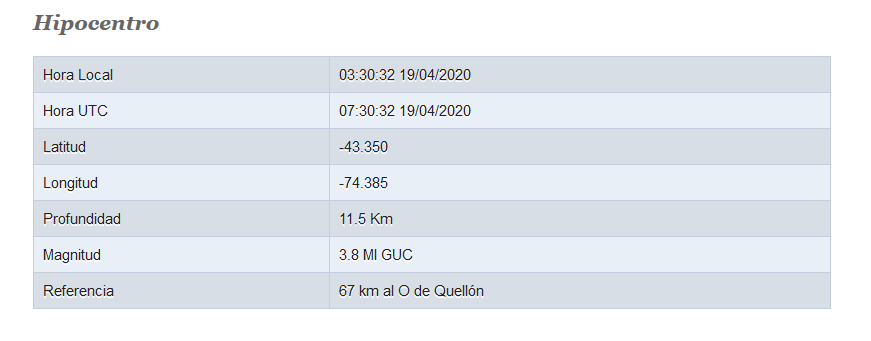 El sismo se situó a 67 km al O de Quellón y tuvo una intensidad de 3.8.