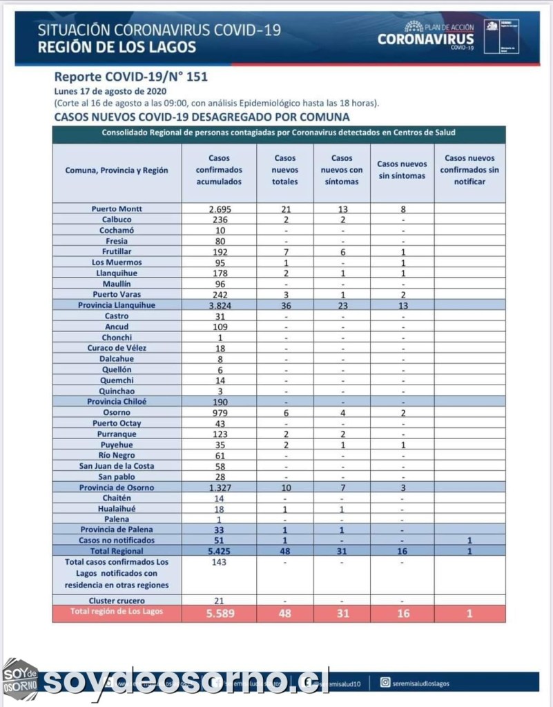 Región de los Lagos registra 48 casos nuevos de Covid-19 Central Noticia Actualizado: Agosto 17, 2020 Whatsapp Facebook Twitter Linkedin Copy link
