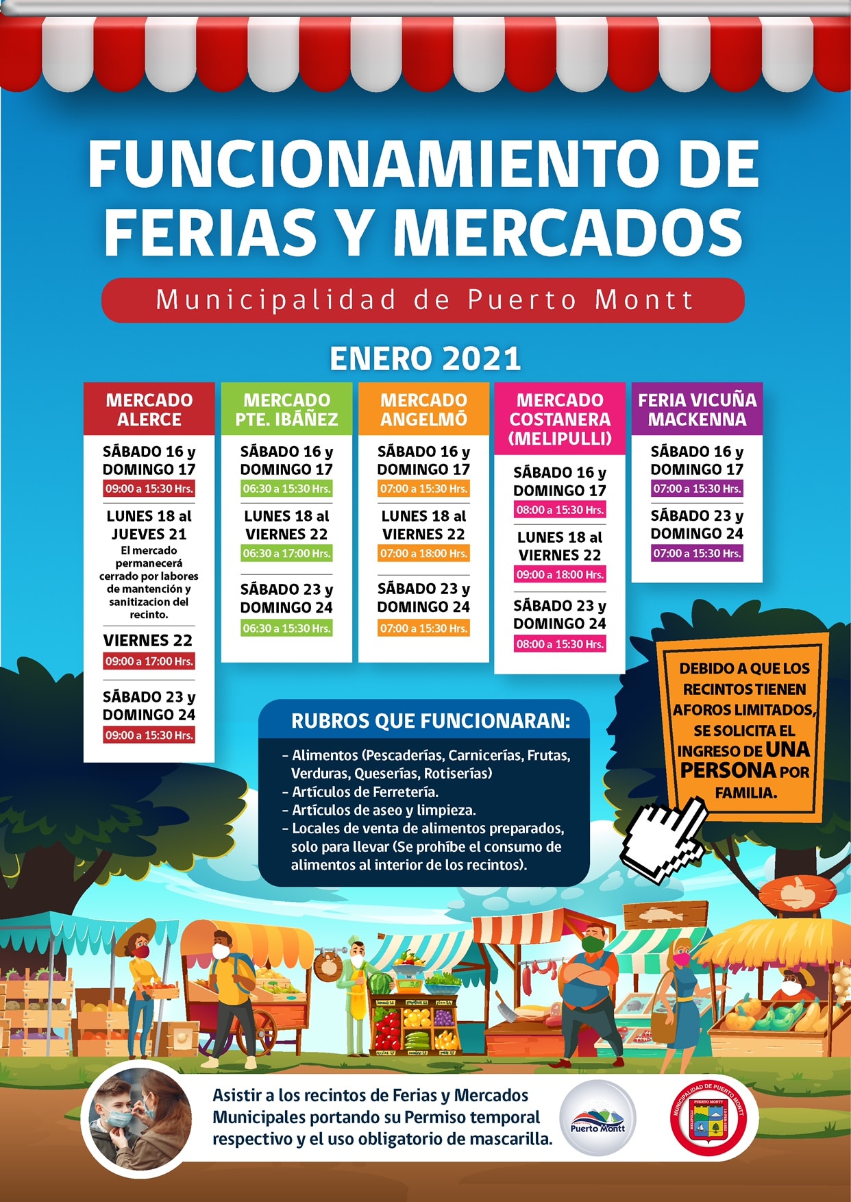 La Municipalidad de Puerto Montt informa a los vecinos mientras dure la cuarentena ferias y mercados municipales estarán funcionando con todas las medidas preventivas sanitarias al interior de los locales, con la exigencia de medidas de protección personal de los clientes que ingresen al recinto y además con el permiso de desplazamiento temporal, que se obtiene en comisaríavirtual.cl.
