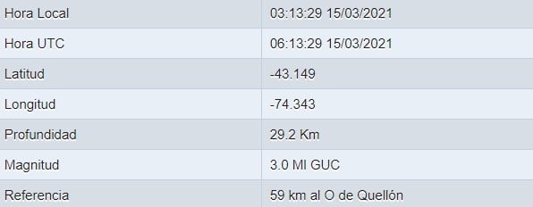 El epicentro se situó a 59 km al O de Quellón y tuvo una intensidad de 3.0.