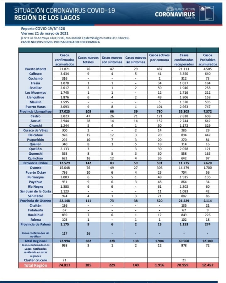 Región de los Lagos registró 385 casos nuevos de Covid-19
