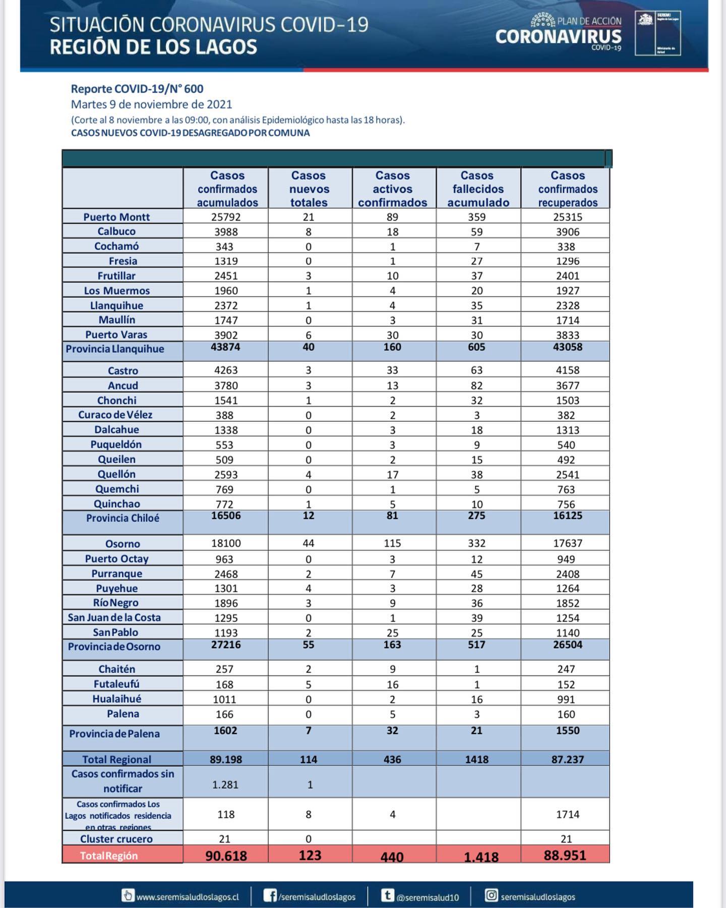 123 casos se registraron en el día de hoy en la Región de los Lagos.