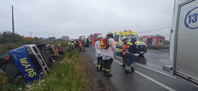 En el kilómetro 1.015 de la Ruta 5 a la altura del Regimiento Sangra, en el tramo que une Puerto Montt con Puerto Varas, volcó un minibús de la empresa Suvai en la mañana de este lunes.