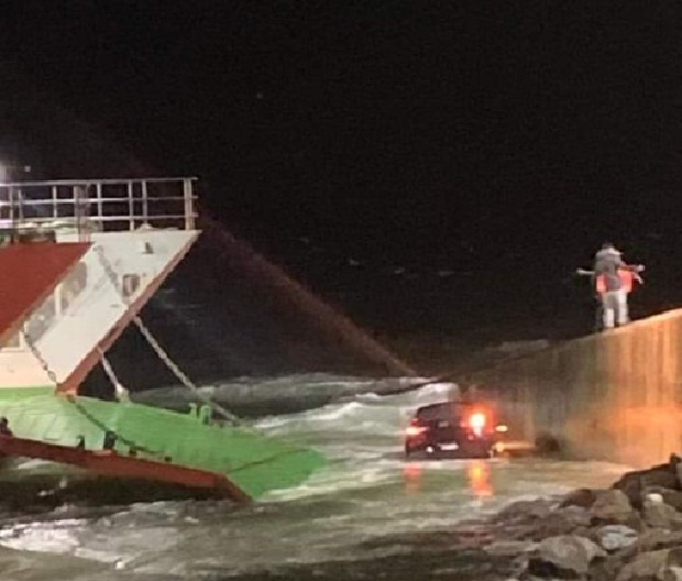 Según consiga Diario de Puerto Montt, el accidente ocurrió luego que, producto del mal tiempo, una ola habría elevado el portalón de la barcaza donde venía abordo y deslizado la nave hacia atrás, motivo por el cual el auto quedó en el aire y se precipitó al agua.