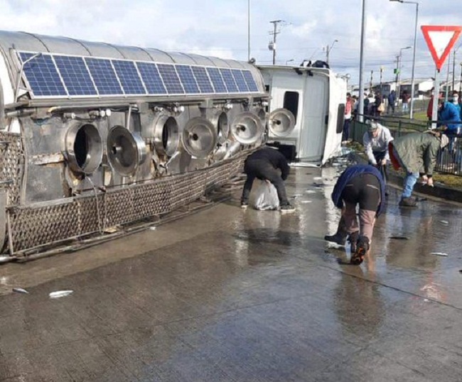 Este miércoles se volcó un camión que transporta salmones vivos en la rotonda de camino Avenida Volcán Puntiagudo con Ramón Monte en Puerto Montt, región de Los Lagos.