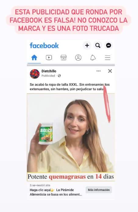 “¡RECALCO QUE ES FALSO! Nunca he participado para una campaña de esta supuesta marca y mucho menos he dado declaraciones sobre los beneficios que entrega este producto”, agregó en otro post.