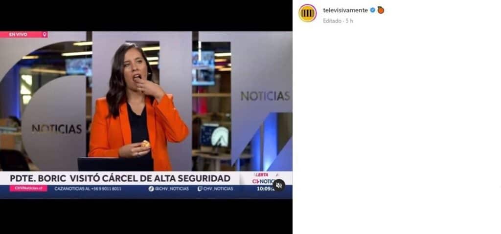 Luego de que la periodista de Chilevisión, Marianela Estrada, fuera captada comiendo una naranja en medio del despacho de una noticia, fue ella misma quién reaccionó con bastante humor a través de sus redes sociales.