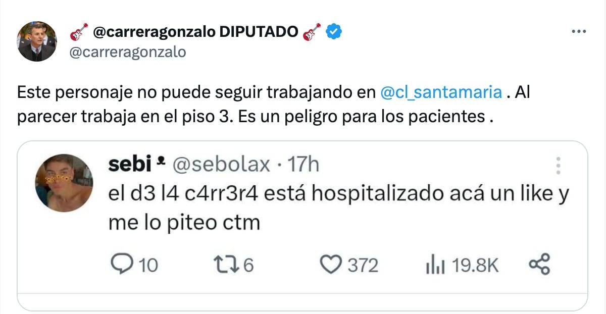 “Este personaje no puede seguir trabajando en @cl_santamaria. Al parecer trabaja en el piso 3. Es un peligro para los pacientes”, tuiteó el diputado De La Carrera.