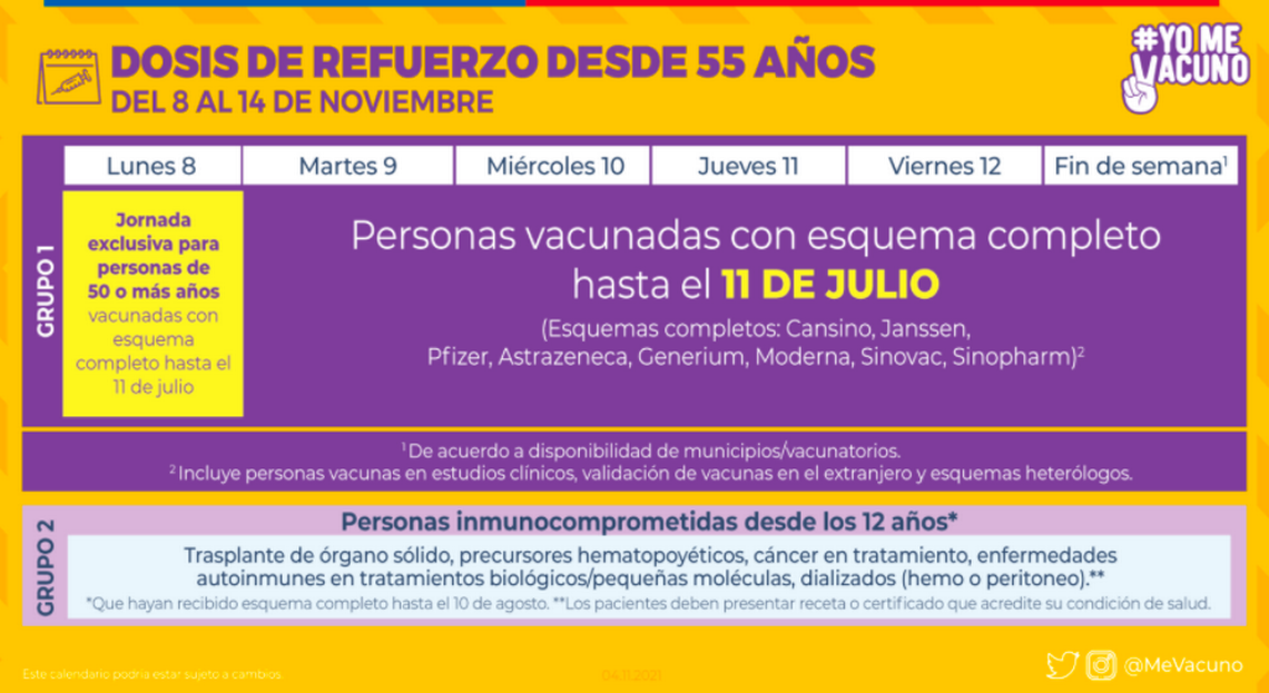 Por último, se informó que las personas de 30 y 39 años con esquema completo Sinovac hasta el 11 de julio, también tendrán que aplicarse la dosis de refuerzo en los días dispuestos para cara grupo etario.