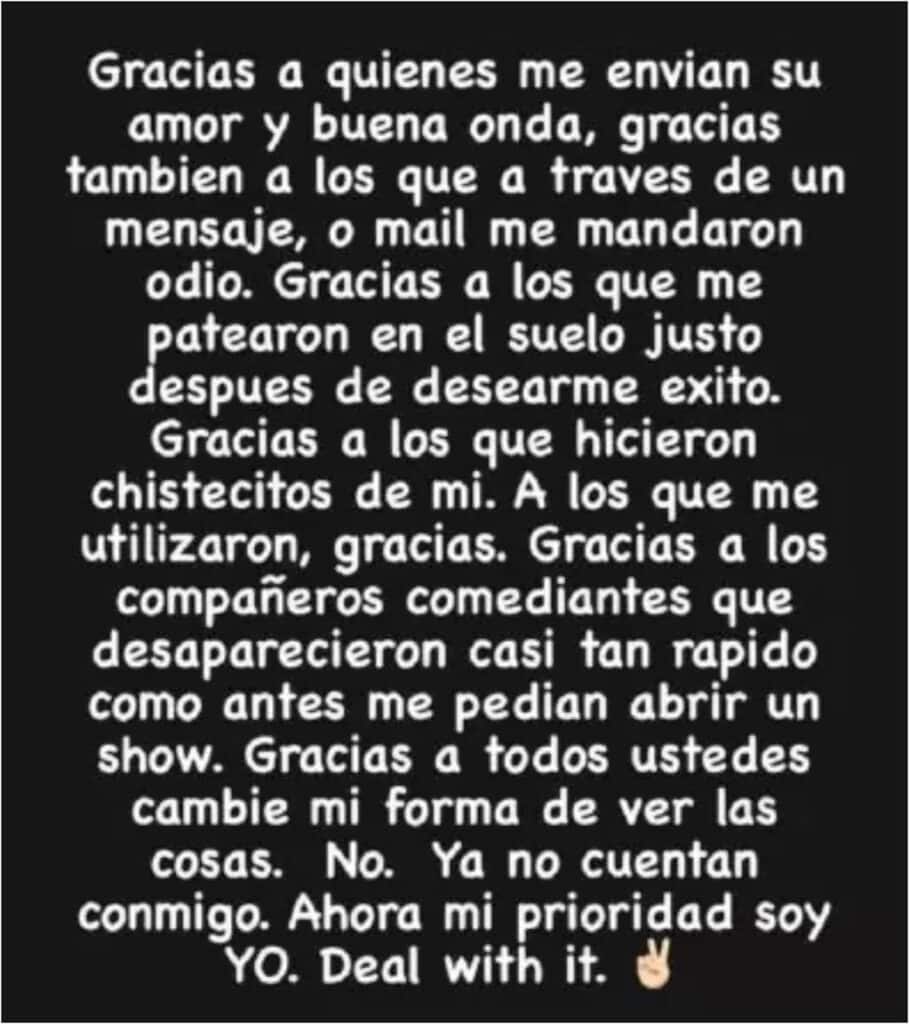 También “agradeció” a “los compañeros comediantes que desaparecieron casi tan rápido como antes me pedían abrir un show”.