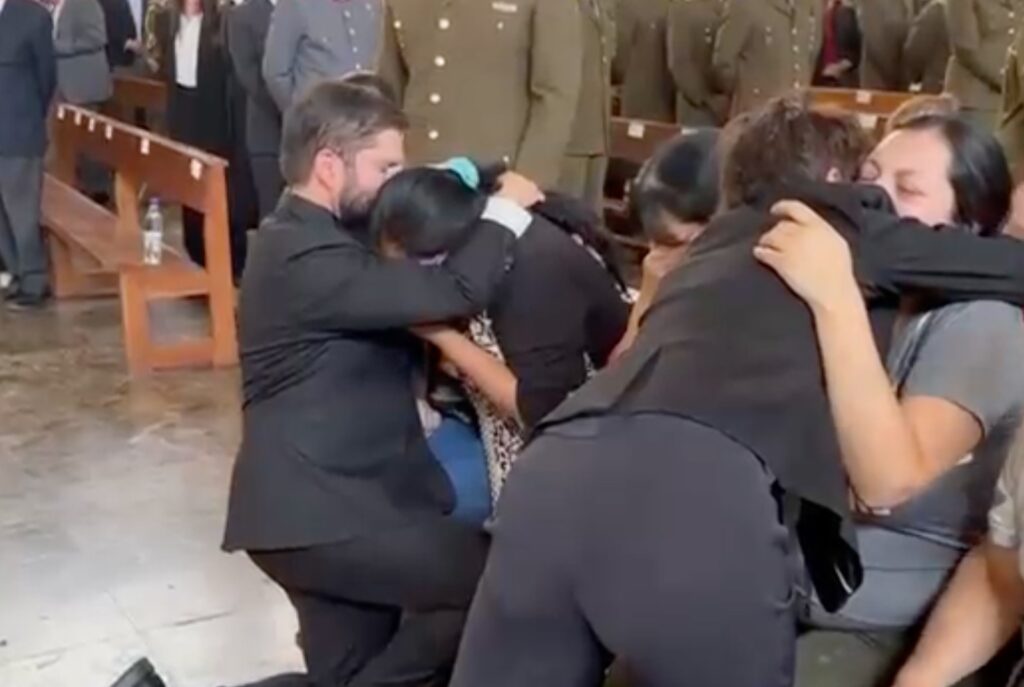 En ese contexto, Boric se acercó a la familia del cabo Palma para extenderle su sentido pésame e intentó consolar a la viuda de Daniel Palma, y a su madre.