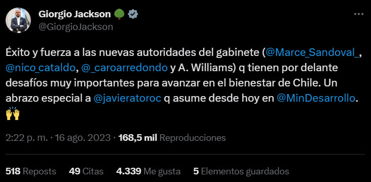 “Éxito y fuerza a las nuevas autoridades del gabinete (Marcela Sandoval, Nicolás Cataldo, Carolina Arredondo y Aurora Williams), q tienen por delante desafíos muy importantes para avanzar en el bienestar de Chile. Un abrazo especial a Javiera Toro, q asume desde hoy en Ministerio de Desarrollo Social“, fue el mensaje de Jackson en sus redes sociales.