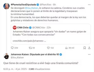 En una entrevista que generó amplia controversia, Kaiser declaró que “sin duda” apoyaría un nuevo golpe militar en Chile si se repitieran las condiciones de 1973, afirmando que asumiría “con todas las consecuencias”.