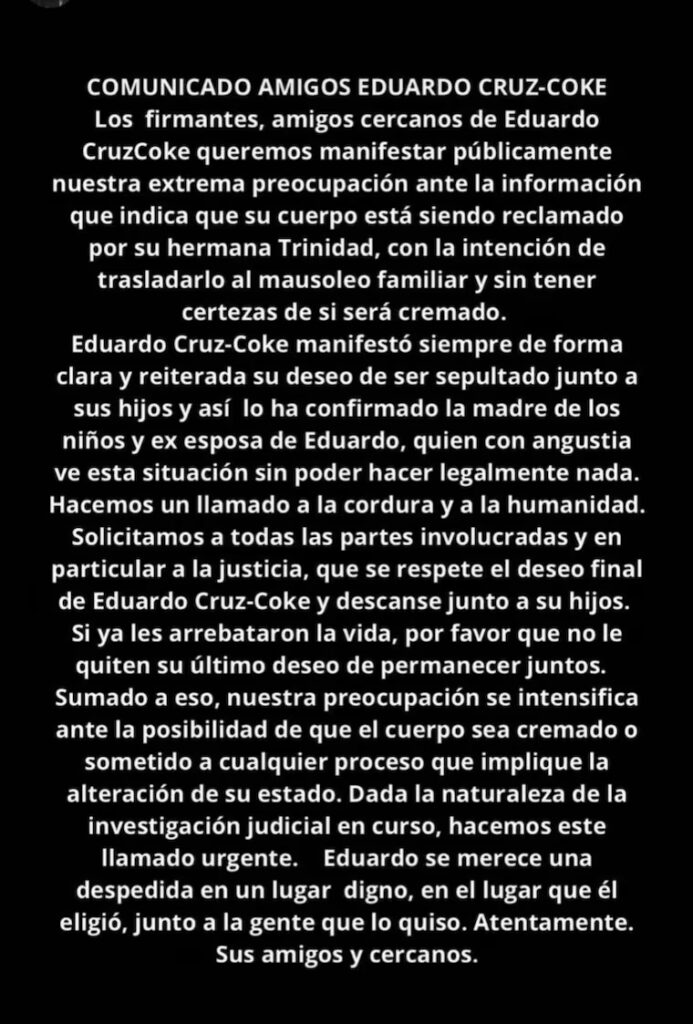 El triple homicidio que estremeció a La Reina —donde el cineasta Eduardo Cruz-Coke y sus dos hijos de 17 años fueron asesinados— sumó un nuevo episodio de tensión, esta vez originado por un comunicado difundido en redes sociales por el círculo cercano del fotógrafo.