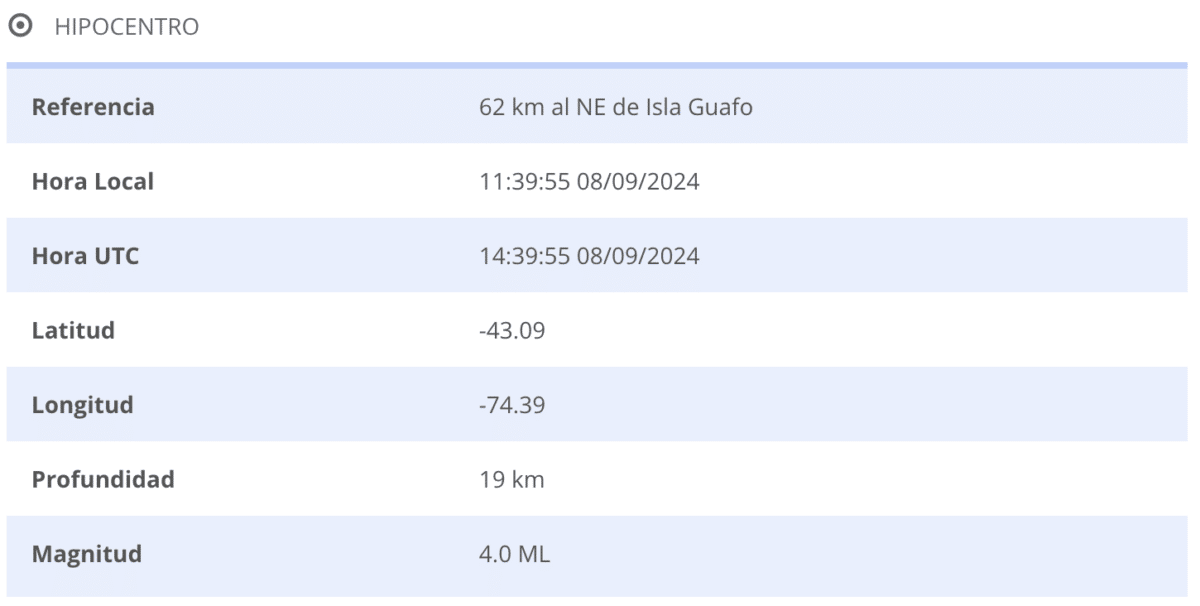 Sismo de magnitud 4.0, con epicentro a 62 km al NE de Isla Guafo a y a una profundidad de 19 km.