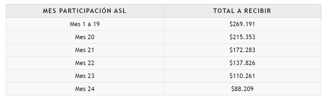 A pesar de que el monto máximo de este beneficio es de $269,191, el total varía según el mes de participación en el Programa de Acompañamiento Sociolaboral (ASL). Los montos se distribuyen de la siguiente manera: