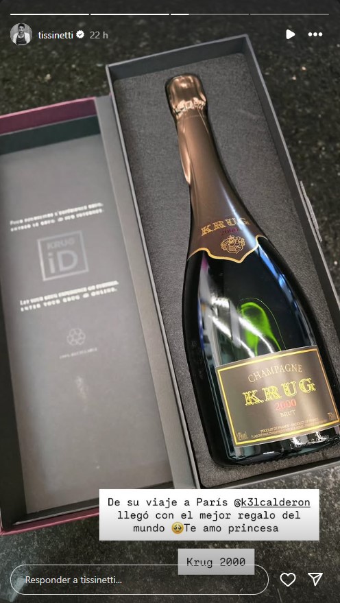 Tissinetti, que también es bien activo en redes, no dudó en mostrar el presente que recibió de parte de su pareja. Se trata nada más y nada menos que de un champagne Krug 2000 tipo Brut, una joyita enológica que muchos sueñan con probar.