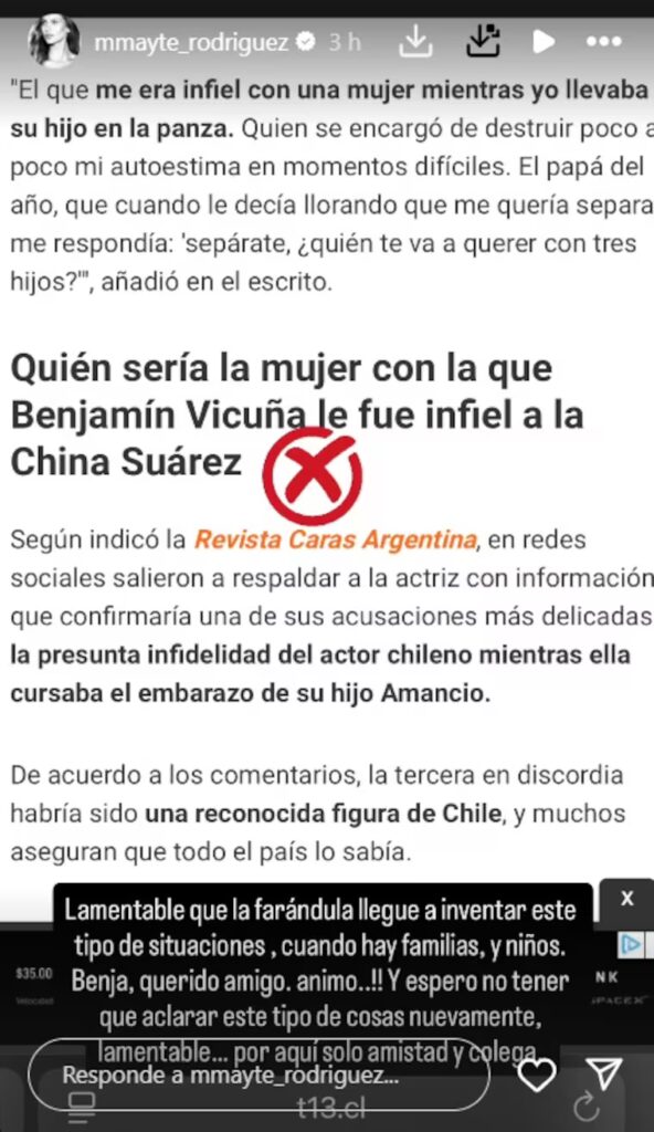 “Benja, querido amigo, ánimo. Y espero no tener que aclarar este tipo de cosas nuevamente, lamentable… por aquí solo amistad y colega”, remató, dejando claro que entre ellos no hubo nada más allá de una relación profesional y afectiva de compañerismo.