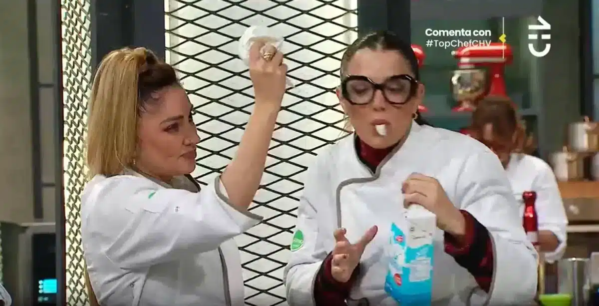 A pocos minutos del final, la actriz tomó una caja de leche y, en lugar de abrirla con las manos o utensilios, la rasgó con los dientes. El hecho sorprendió a la chef Fernanda Fuentes, quien exclamó en voz alta: “¿Qué está haciendo?”, para luego agregar, incrédula: “¡Escupió el pedazo de cartón!”