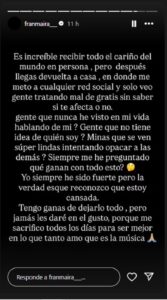 Junto con borrar sus publicaciones, Fran cambió su foto de perfil y compartió un extenso mensaje en sus historias, donde expresó su agotamiento emocional. “Es increíble recibir todo el cariño del mundo en persona, pero después llegas de vuelta a la casa, en donde me meto a cualquier red social y solo veo gente tratando mal gratis, sin saber si te afecta o no”, lamentó.