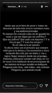 Horas más tarde, Fran compartió otro mensaje donde abordó los rumores sobre su vida personal: “A veces contamos cosas y son mal interpretadas. Yo siempre he contado cómo me he ganado las cosas y ¿que digan que soy put…? ¿Que soy per…? ¿Que ando con mayores? Y si fue así, ¿qué? Y si no fue así, ¿qué?”, escribió con firmeza.