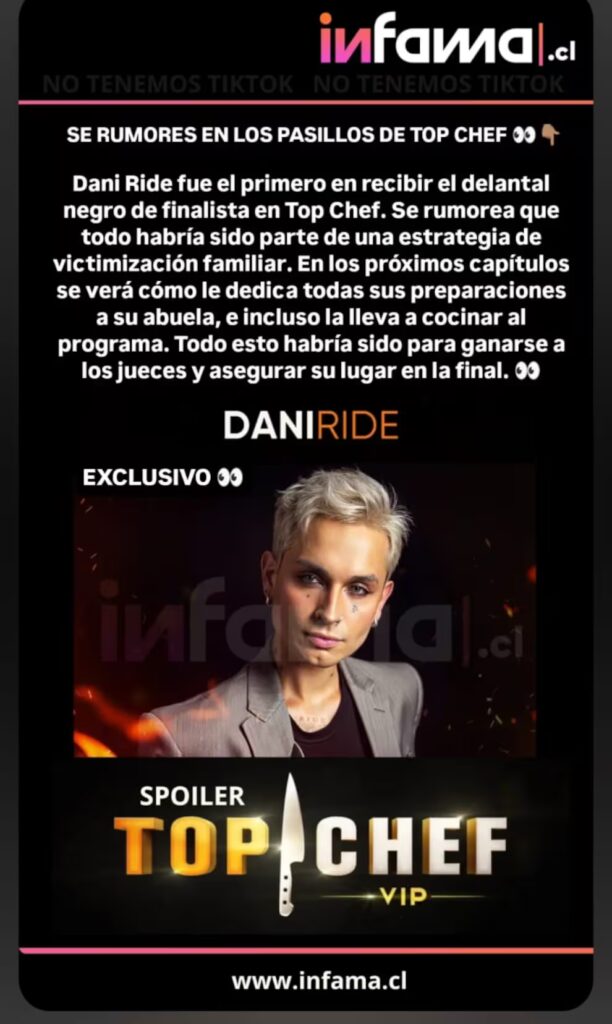 De acuerdo con Infama, los seleccionados que llegaron a la fase final del programa serían los cantantes Dani Ride y Carola Soto, junto a los actores Mafe Bertero, Yamila Reyna y Ricardo Fernández. Este grupo se enfrentará por el título de Top Chef VIP Chile, en una definición que promete emociones y talento en la cocina.