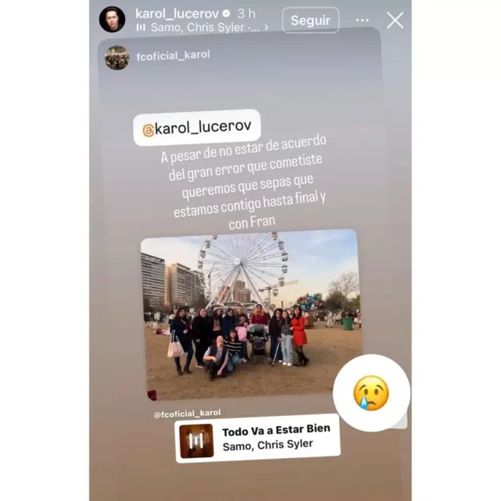 En una storie compartieron un mensaje dirigido al comunicador: “A pesar de no estar de acuerdo del gran error que cometiste queremos que sepas que estamos contigo hasta final y con Fran”, escribieron junto a la canción Todo va a estar bien.