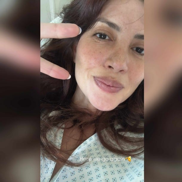 La exintegrante de Mekano sorprendió este miércoles al publicar en sus historias de Instagram una fotografía en la que aparece con bata hospitalaria y recostada en una camilla, mensaje que acompañó con la frase: “Here we go again (acá vamos de nuevo)”.