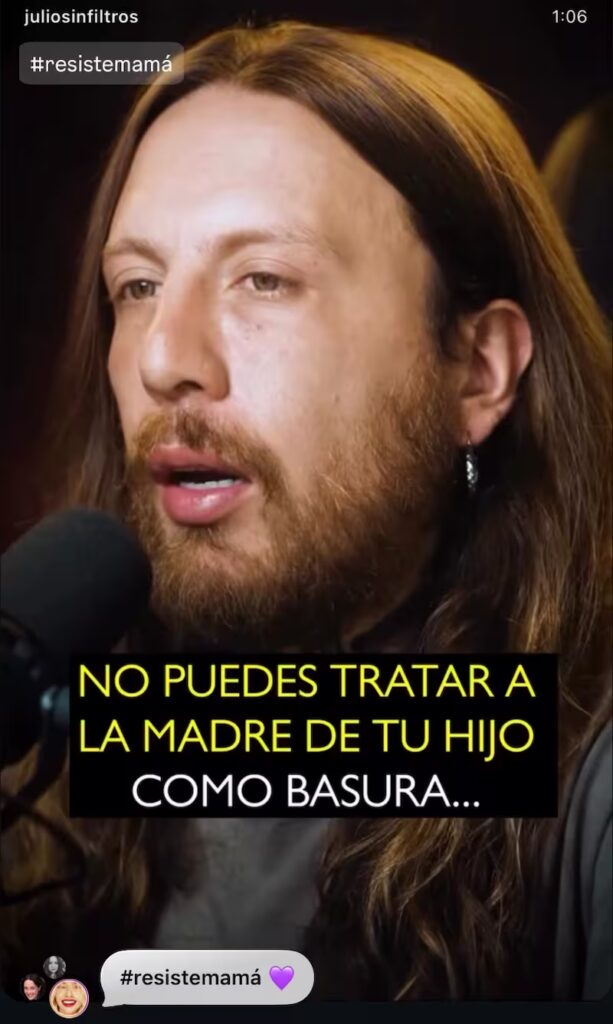 A través de su cuenta de Instagram, Swett publicó un extracto del pódcast Julio Sin Filtros, donde se abordan las consecuencias de una separación en la vida familiar. El mensaje, que ella decidió repostear, comienza diciendo: “No puedes tratar a la madre de tu hijo como basura y al mismo tiempo llenarte la boca diciendo que amas a tu hijo”.